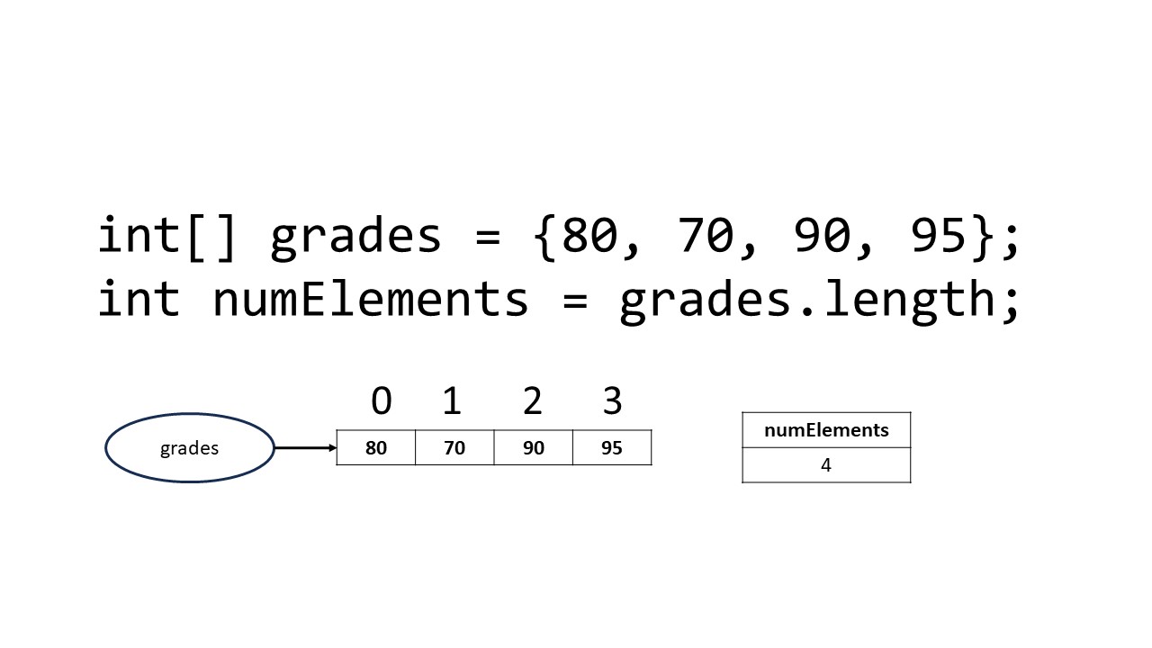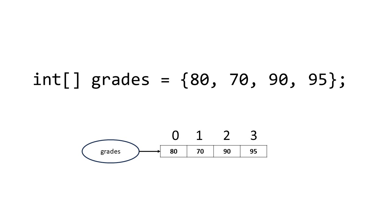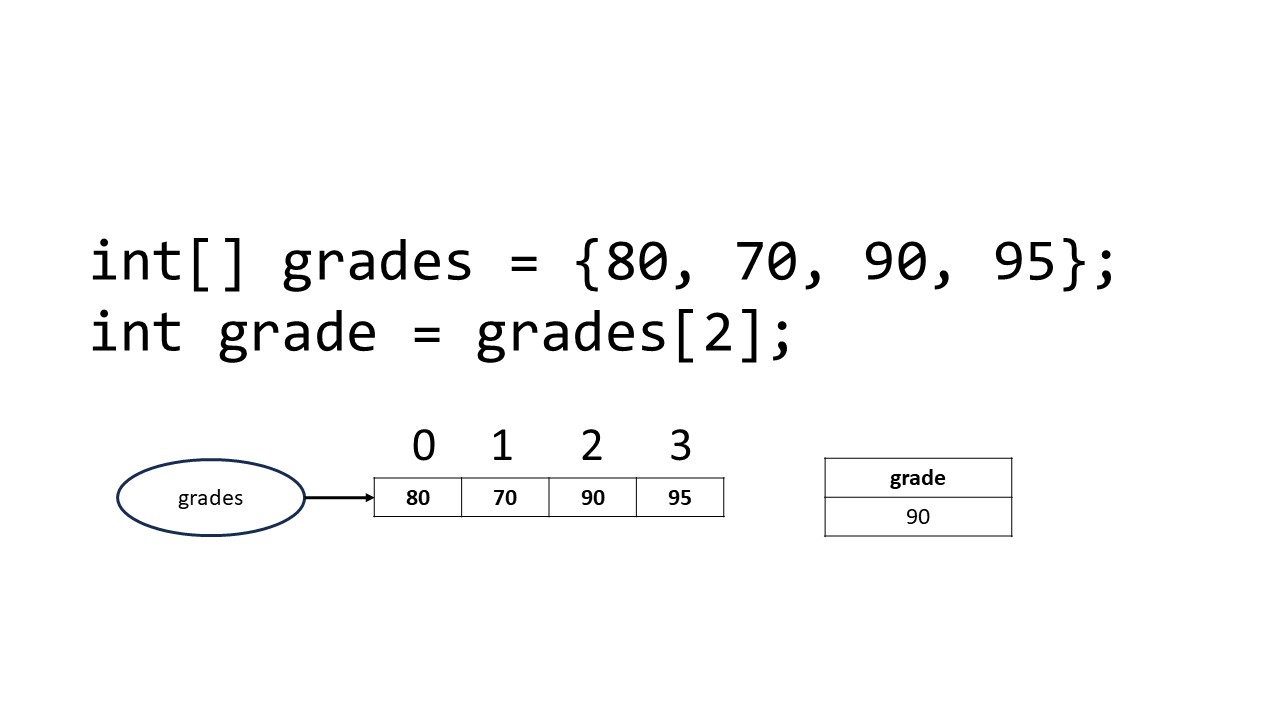 To access the elements of an array, use square brackets ([ ]) and include the index value in the square brackets. If we want to access the first element of an array of grades we would use 0 in the square brackets. To access the third element of the array of grades, we would use 2 in the square brackets, it would look like this: