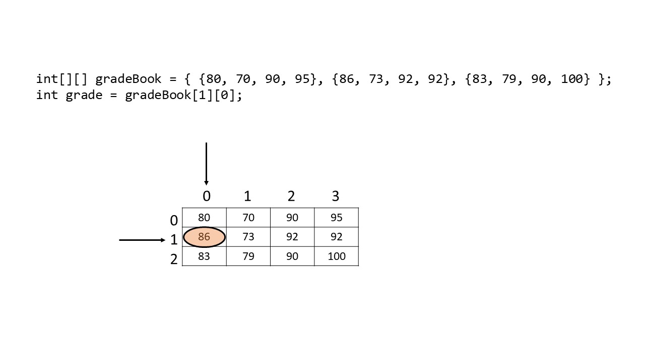 If we want to access the first element in row 0 and column 1, it would look as follows: