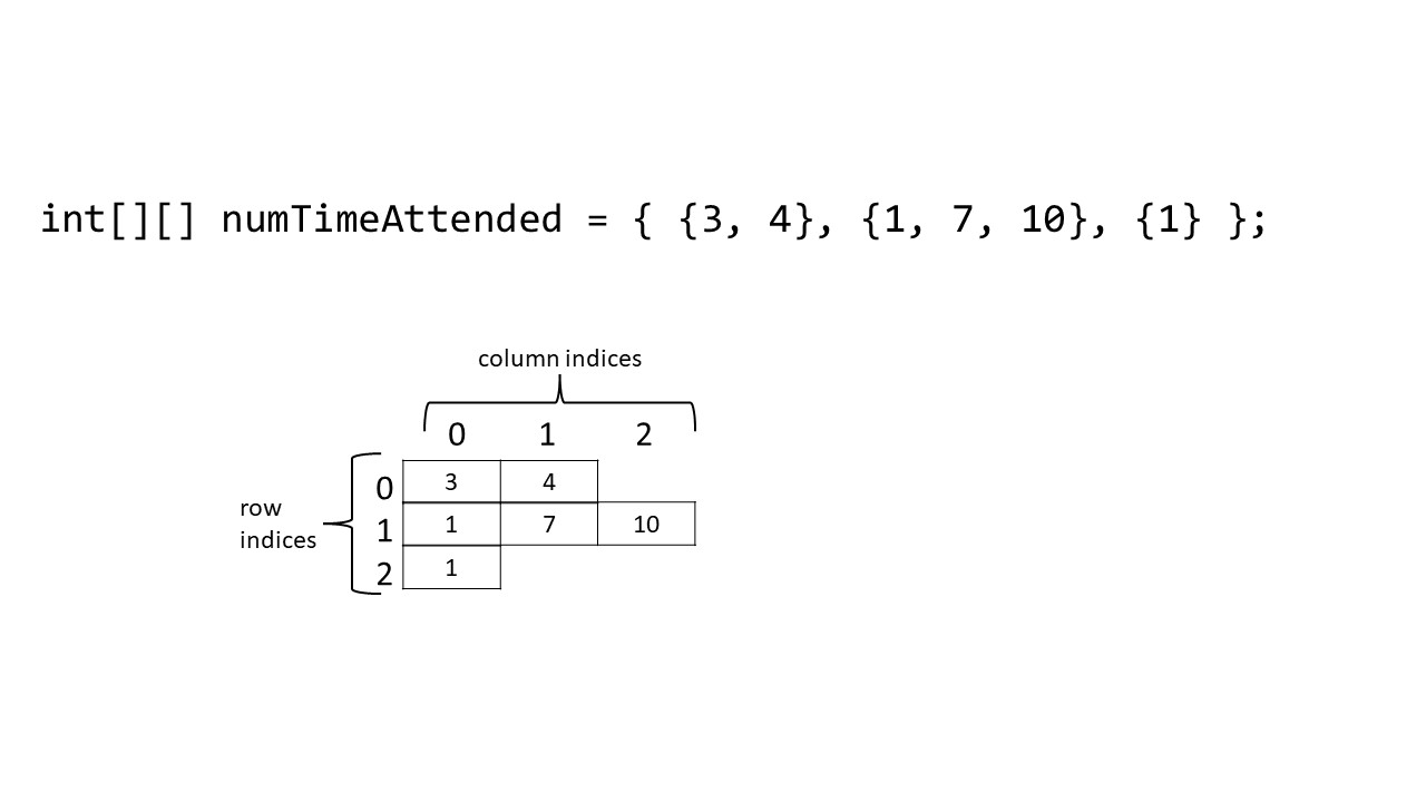 An array of arrays can be used to represent a table of information. This is called a two-dimentional (2D) array.